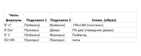 Самый первый и самый распространенный Пиф-Паф это RUR1U1. Я называю его Пиф-Паф или если он используется в связке с другими Пиф-Пафами – Простой Пиф-Паф. Известный спидкубер Максим Чечнев для запоминания этого Пиф-Пафа использует такую историю. «Представьте, что посреди ночи Вам захотелось пить, Вы пошли на кухню и включили свет R (ход R – правая сторона по часовой стрелке – „включает свет“, ход R1 – „выключает свет“), от яркого света у Вас закружилась голова – верх крутим по часовой стрелке U, Вы инстинктивно „выключаете свет“ R1, в голове проясняется – верх крутится обратно – U1». Для отработки быстрого вращения, первое время можно приговаривать про себя: «Включили свет – голова кружится, выключили свет – голова обратно».