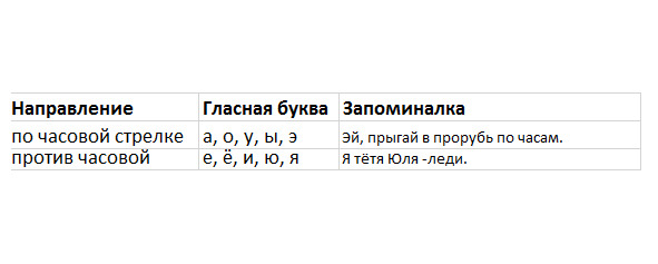 Для обозначения направления вращения автор использовал гласную букву, разделив все буквы на две группы. Первая группа (буквы а, о, у, ы, э) отвечает за направление вращения по часовой стрелке. Вторая группа (буквы е, ё, и, ю, я) отвечает за направление против часовой стрелки.