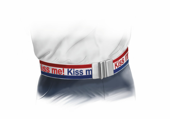 Вечером у папы спросил про ремень. Папа перевел надпись на ремне с английского на русский: «KISS ME!» значит «ПОЦЕЛУЙ МЕНЯ!». С тех пор я начал стесняться своего красивого красно-бело-синего ремня. Иногда рассказывал пацанам о происшествии. Некоторые слегка завидовали и хотели повторить такой же эффект.