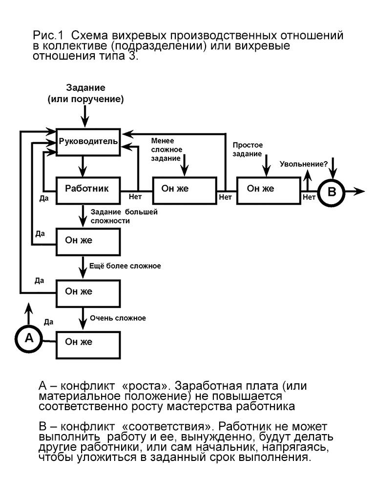 Итак, для ясности понимания таких вихревых событий отобразим этот процесс на графической схеме Рис.1 вихревых производственных отношений в коллективе и отнесем такие вихревые события к вихревым отношениям типа 3.