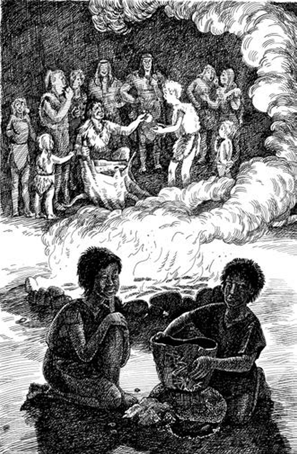 Несколько раз Таука и Юкка ходили к Потоку, и в ладонях приносили воду, чтобы наполнить углубление в коряге. А когда камни раскалились, Таука подцепил их с помощью двух небольших рогатинок и опустил в углубление в коряге. Камни зашипели, пошёл пар. Таука вытащил камни и снова положил на жаркие угли костра. А затем опустил их в корягу с водой. Он попытался вытащить камни из углубления рукой, но вскрикнул от боли – вода стала очень горячей. Тогда Таука ловко вытащил камни с помощью ножа и рогатины, и снова бросил гальку в огонь.