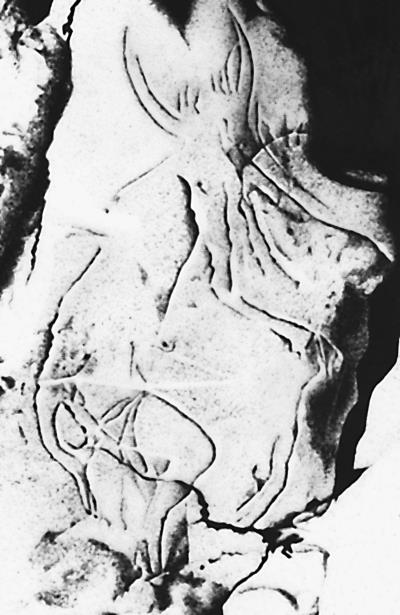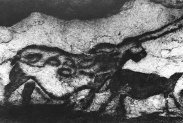 Пещерная живопись таинственной составной фигуры, сочетающей различные мужские символы: оленьи рога, глаза совы, хвост дикой лошади или волка, человеческую бороду и лапы льва (слева); «Танцор», антропоморфная фигура, возможно, танцующего шамана, из пещеры Ла-Габиллу (внизу слева; рисунок, внизу справа).