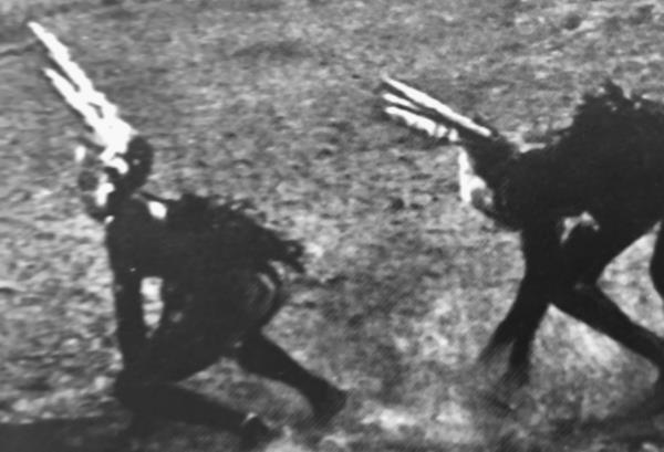 «Мифический Зверь» пещеры Ласко, с длинными, выдающимися спереди параллельными рогами, напоминающими маски австралийских аборигенов (вверху); ритуал австралийских аборигенов: люди племени в масках с двумя параллельными рогами (внизу).