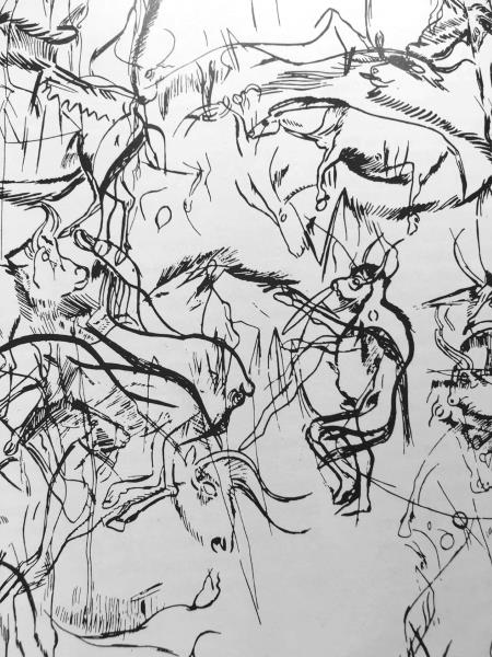 Деталь большой настенной живописи в пещере Ле-Труа-Фрер с изображением антропоморфной фигуры, скорее всего, шаман эпохи палеолита в окружении животных.