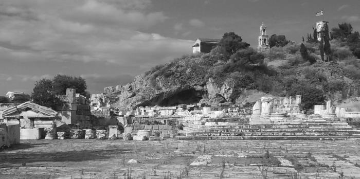 Руины Телестриона, гигантского зала, в котором проходили Элевсинские мистерии. На заднем фоне пещера со входом в нижний мир, в котором, по легенде, Аид скрывал похищенную Персефону.