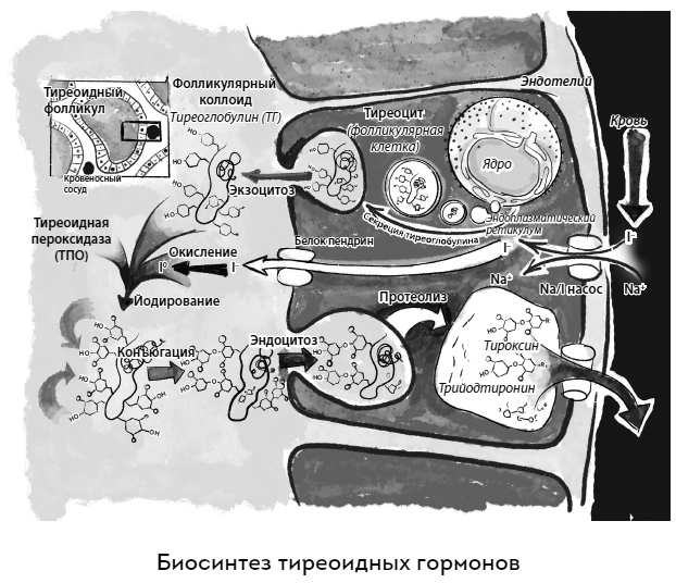 Синтез (то есть создание, построение) гормонов щитовидной железы – это очень сложный и многоступенчатый процесс. Я думаю, что такие реакции, названия которых с непривычки невозможно выговорить (например, транспорт через натрий-йодный симпортер или роль пендрина), мы опустим, дабы не забивать ваши головы ненужной и сложной информацией, а сосредоточимся на основных процессах. Повторю, что эта книга адресована прежде всего пациентам, поэтому я не вижу смысла увлекаться сложными понятиями и определениями.