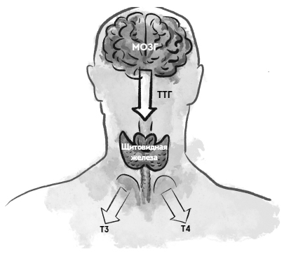 Ситуация 1: когда щитовидная железа работает плохо. Именно к такой ситуации относится заболевание, которому посвящена наша книга. При аутоиммунном тиреоидите щитовидная железа перестает нормально функционировать, и со временем она уже не обеспечивает организм нужным количеством гормонов. В результате их концентрация в крови падает – это состояние называется гипотиреоз («гипо» – «мало», «тир» – «гормоны щитовидной железы»). На такое снижение уровня гормонов очень быстро реагирует гипофиз и, пытаясь «завести» отключенную щитовидную железу, начинает вырабатывать больше ТТГ. В этом случае в лабораторных анализах наблюдается следующая картина: высокий ТТГ, низкие концентрации свободного Т4.