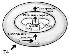 Бóльшая часть Т3 образуется путем дейодирования в клетках (общая скорость их производства составляет от 30 до 40 мкг), а в противовес самой щитовидной железе вырабатывается лишь ее малая часть. То есть Т4 можно рассматривать как ПРОгормон, который активируется путем дейодирования уже в самих клетках.