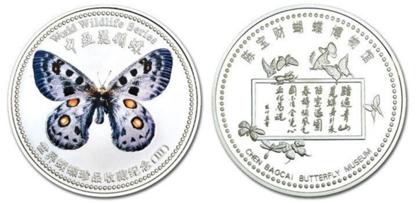 Chinese coin with a depiction of Parnassius actius (Eversmann, 1843)