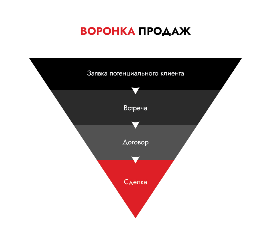 В работе риелтора, как и в любом бизнесе, всегда работают законы воронки продаж, ниже приведу иллюстрацию воронки в упрощенном виде.