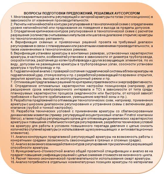 Этот, далеко неполный перечень возможных направлений работы по анализу работы регулирующей и автоматической запорной арматуры, контуров регулирования и технологических схем, дает представление о возможностях повышения конкурентоспособности технико-коммерческих предложений и может дополняться в зависимости от особенностей проектов.