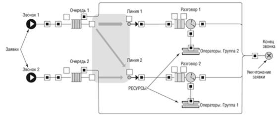 Заявки, в данном случае звонки, представляют собой некие пассивные объекты, которые перемещаются, захватывают и освобождают ресурсы согласно потоковым диаграммам – схемам, описывающим изучаемый процесс. Заявки могут представлять собой людей, товары, детали, документы, сообщения. ДС моделирование является дискретным – каждому событию соответствует определенный дискретный момент времени. Характерной чертой данного подхода является «обезличенность» заявки, от ее индивидуальных свойств абстрагируются. Считается, что все заявки обладают универсальной логикой поведения и обрабатываются по единому, заранее известному алгоритму. Ядро модели отвечает за генерацию, обработку и уничтожение заявок.