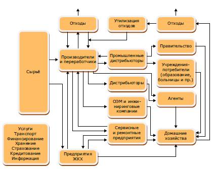 Обмен может быть понят нами в более широком смысле, как взаимодействие посредством обмена между всеми участниками рынка в стране, как это трактуется в общеэкономическом смысле. Нам важно понимать это для того, чтобы учитывать взаимодействие и изменение в обменных процессах за пределами нашего влияния. Схема обмена в промышленности и взаимодействия между различными участниками промышленного рынка приведена на рис. 1.2.