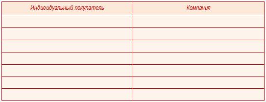 Используйте колонки "покупатели", для того, чтобы провести различия между индивидуальным покупателем и покупателем от организации. Для начала Вам следует сделать одно различие. Затем сравните ваши суждения с приведенными ниже. Отметьте положения, которые применимы к организации, и к Вам, как индивидуальному покупателю.