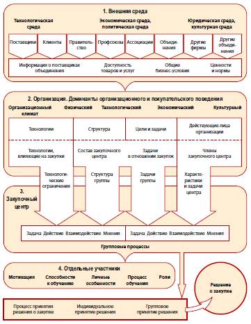 Четыре организационные подсистемы (технологии, структура, цели / задачи и участники) взаимодействуют друг с другом, определяя функционирование организации и выявляя информационные потребности, цели, позиции и предположения отдельных сотрудников закупочного центра. Задачи закупки можно описать в терминах представленного выше восьмиэтапного процесса принятия решения, а затем разделить на четыре аспекта: