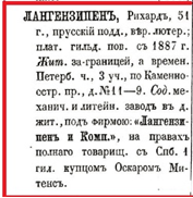 В 1878 году создается товарищество "Лангензипен и К". Оно было учреждено в 1878 году в форме полного товарищества прусским подданным, петербургским купцом 2-й гильдии советником коммерции Рихардом Лангензипеном из Магдебурга и петербургским купцом 2-й гильдии Оскаром Митенсом. Уставной капитал товарищества составлял тогда внушительные 30.000 руб.