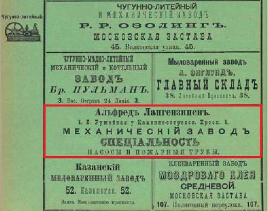 Об Альфреде следует сказать подробнее, поскольку его роль в становлении завода малоизвестна. Альфред Лангензипен начал вести бизнес в России до Рихарда. Сначала в Санкт-Петербурге была основана компания: "Альфред Лангензипен", в которой владельцем значился как раз младший брат Рихарда Лангензипена, а именно Альфред Лангензипен, но по другому адресу. Это уже потом канула в лету фирма "Альфред Лангензипен" и появилась "Лангензипен и К" на Каменноостровском,9-11 и Альфред туда перебрался. Из справочника по купцам в Санкт-Петербурге 1-й и 2-й гильдии за 1880 год следует, что Альфред Лангензипен имел большой опыт и был владельцем фирмы "Альфред Лангензипен". Тогда, в 1880 году он был купцом 2-й гильдии в возрасте 24 лет и специализировался на пожарных трубах и насосах, которые потом, в объеме продукции "Лангензипен и К" занимали видное место.