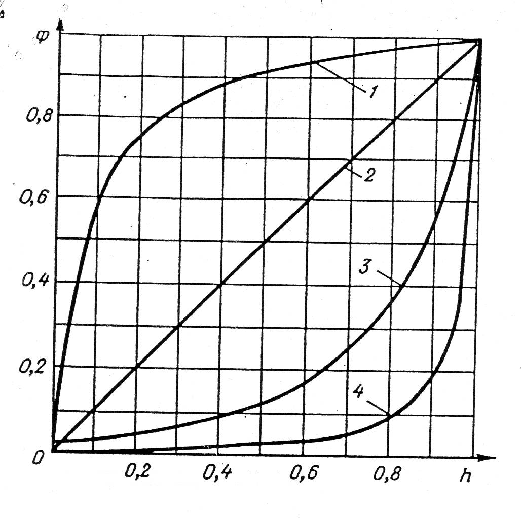 На рис.2.1. представлены пропускные характеристики наиболее распространенных клапанов в их функциональной зависимости от коэффициента пропускной способности Ф и степени открытия h.