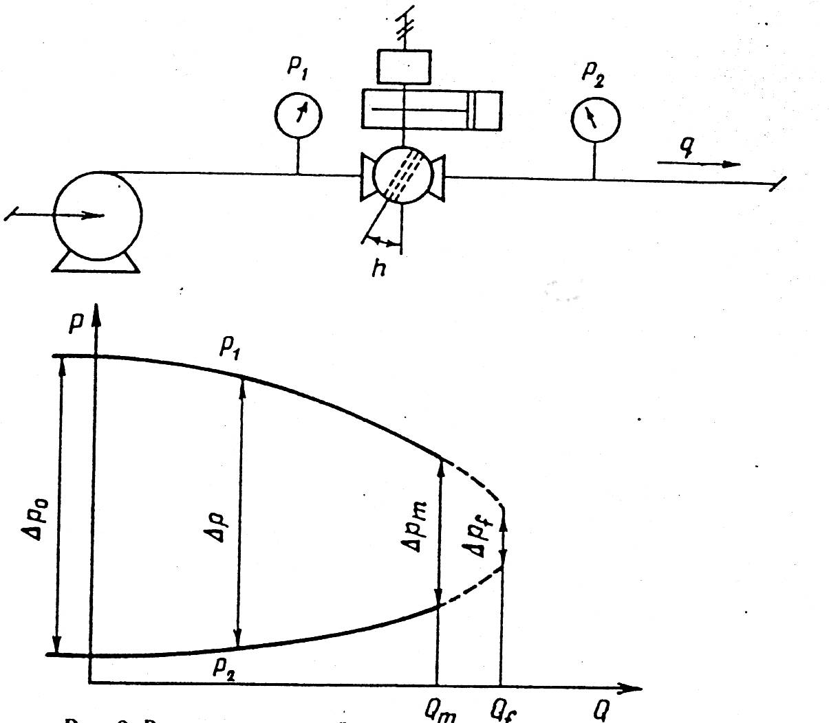 На практике регулирующий клапан – часть технологического трубопровода. Перепад давления в зоне открытия клапана редко постоянен, т.к. при росте величины потока вследствие динамических потерь давление потока на входе клапана падает, а на выходе увеличивается. Поэтому зависимость величины потока q от степени открытия клапана h (вид установочной характеристики) есть функция, как технологического трубопровода, так и внутренней кривой клапана. Влияние изменений перепада давления на регулирующий клапан, установленный в технологическом трубопроводе, показан на рис.2.2.