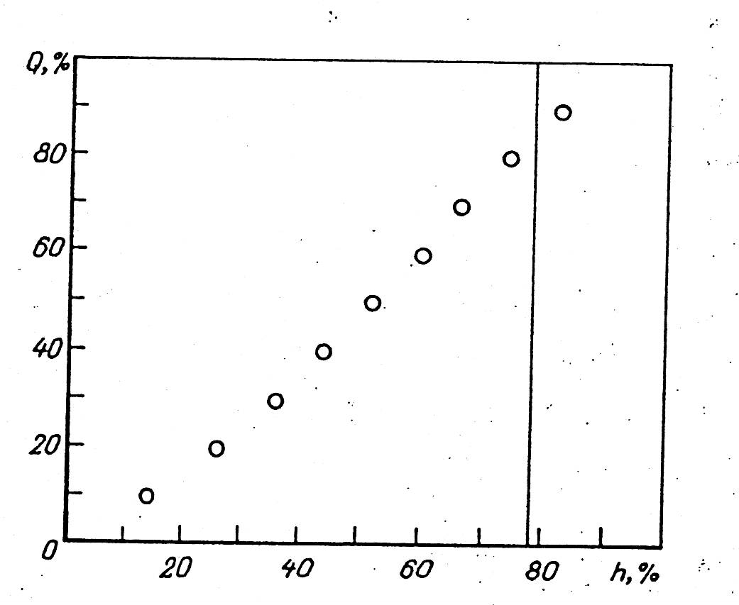 Характеристики клапана замеряются в условиях, когда перепад давления постоянен. В этом случае величина потока, проходящего через клапан «q» пропорциональна его коэффициенту пропускной способности Сv. Так как коэффициент пропускной способности клапана выражает со своей стороны эффективную величину поперечного сечения потока, то по характеристике клапана можно видеть, что эффективность поперечного сечения потока меняется в функциональной зависимости от степени открытия «h» клапана.