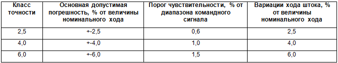 В существующих стандартах класс точности регулирующих клапанов с позиционером должен быть не ниже 2,5. Чтобы проконтролировать соответствие хода регулирующего клапана определяется значения основной погрешности, порога чувствительности и вариации хода штока. Эти параметры оцениваются по ходовой характеристике регулирующего клапана на полностью собранном и отрегулированном изделии при незаполненном средой корпусе и сальнике, обеспечивающем герметичность подвижного соединения штока при условном давлении Ру. Пневматический сигнал при этом проверяется с точностью +– 0,4% от максимального значения, перемещение – с точностью +-0,5% от номинального хода штока.