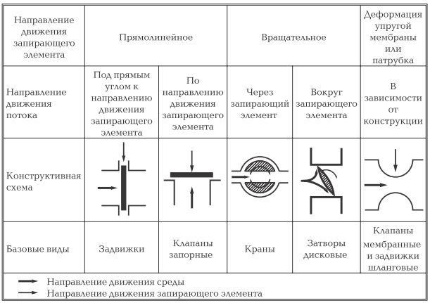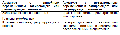 Арматура, используемая в промышленности, может быть разделена на арматуру с линейным перемещением запирающего или регулирующего элемента, как правило, многооборотную и с вращательным (на четверть оборота) перемещением, как показано в табл. 1.1.