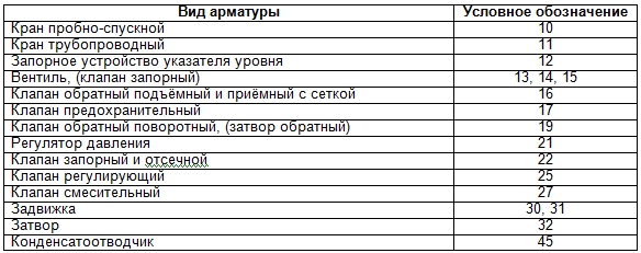 Действующие ранее ГОСТы предусматривали условные обозначения арматуры, состоящие из наименования, номера конструктивного типа (римские цифры I, II и т. д.) и исполнения (заглавные буквы А. Б, В и пр.), условного прохода в мм, условного давления в кгс/см2 и номера ГОСТ. Например, клапан запорный II-А-50–40 ГОСТ 9659–66. Эти стандартные обозначения часто используются проектировщиками. Однако в каталогах на арматуру и приводы, в номенклатуре предприятий, на рынке арматуры применяют не стандартные, а отраслевые условные обозначения. Это – известные всем таблицы/фигуры.