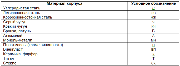 Табл. 1.3. Условные обозначения материала корпуса арматуры