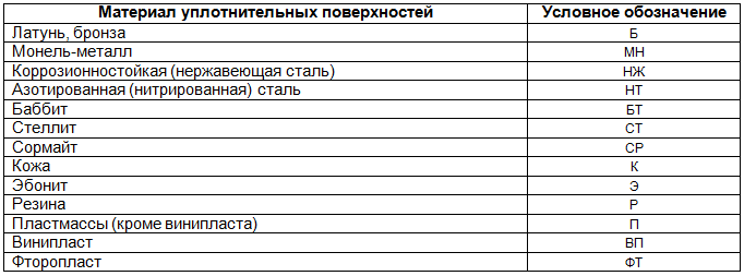 Табл. 1.5. Условные обозначения материала уплотнительных поверхностей