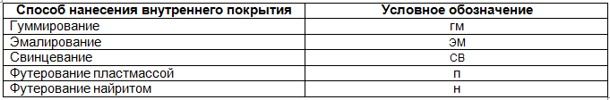 Табл. 1.6. Условные обозначения внутреннего покрытия корпуса
