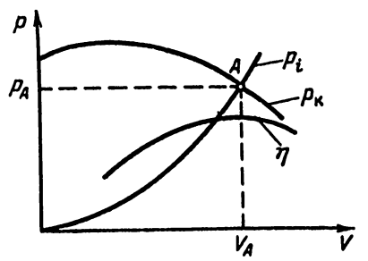 Точка пересечения характеристики компрессора рк = f(V) называется рабочей точкой или рабочим режимом компрессорной установки. Точка пересечения А определяет условия материального и энергетического баланса системы, как показано на рис. 1.3.