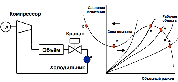 Работа компрессора устойчива, если при изменении производительности системы по любой причине компрессор восстанавливает первоначальный режим работы. В противном случае работа компрессора неустойчива и может возникнуть явление помпажа.