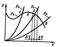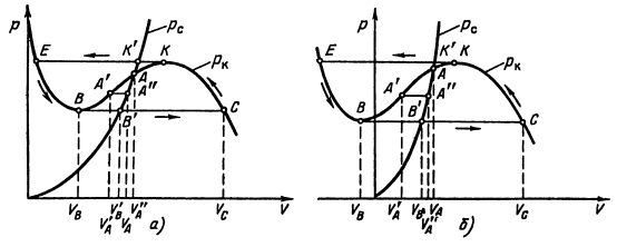 В этих случаях точки пересечения характеристики компрессора в системе обеспечивают устойчивый режим работы компрессора. Если рабочая точка А расположена справа от точи К – максимума характеристики компрессора, то при кратковременном увеличении производительности ∆ V давление рс системы становится больше давления рк компрессора.