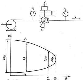 На практике регулирующий клапан – это часть технологического трубопровода. Перепад давления в зоне открытия клапана редко постоянен, т.к. при росте величины потока вследствие динамических потерь давление потока на входе клапана падает, а на выходе увеличивается. Поэтому зависимость величины потока q от степени открытия клапана h (вид установочной характеристики) есть функция, как технологического трубопровода, так и собственной пропускной характеристики клапана. Влияние изменений перепада давления на регулирующий клапан, установленный в технологическом трубопроводе, показан на рис.2.2.