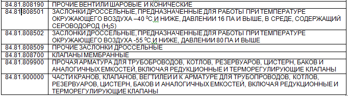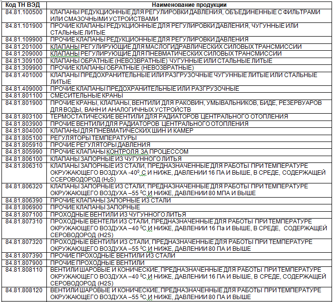 Табл. 1.7. Номенклатура арматуры по ТН ВЭД