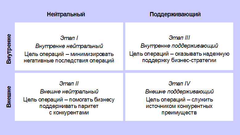 На этапе III – внутренне поддерживающем – операционная функция имеет характеристики на уровне лучших организаций в данном секторе, и следовательно, обеспечивает организации конкурентные преимущества. Цель операций – оказывать надежную поддержку бизнес-стратегии.