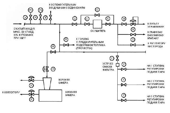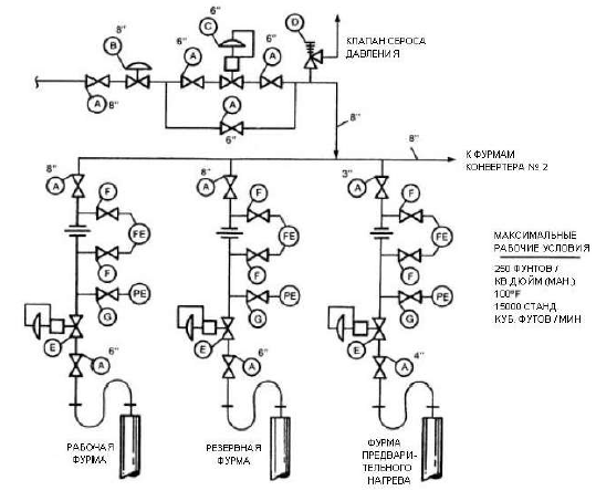 Схема установки клапанов для подачи кислорода в конвертер и печи показана на рис. 3.4.