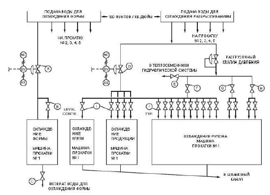 Рис. 3.6. Схема установки арматуры в системах охлаждения роликов МНЛЗ [3]