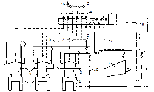1, 2, 3 -охлаждаемые детали: 4 – бак-сепаратор пара; 5 – система питающих труб, 6 – регулировочные вентили, 7 – система труб, отводящих пароводяную эмульсию; 8 – коллектор пара: 9 – выпуск пара в атмосферу; 10- дозатор и – подвод добавочной воды