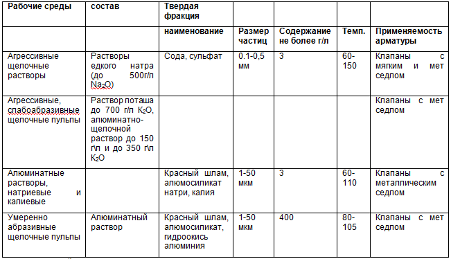 Основная часть аппаратов включена в непрерывный многозвенный технологический процесс, работающий круглосуточно. В таких условиях ненадежная работа арматуры приводит к большим непредвиденным остановам и потерям. Основные среды глиноземного производства приведены в табл. 3.1.