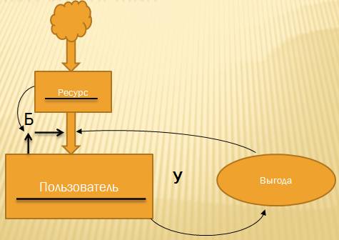 Когда ресурс находится в общественном пользовании, каждый потребитель получает непосредственные блага от его использования. Но при злоупотреблении ресурсом негативные последствия распределяются на всех потребителей. Из-за этого обратная связь от состояния ресурса к потребителям, принимающим решения, очень слаба. В результате ресурс используется слишком интенсивно; он истощается, пока не разрушается полностью, становясь недоступным для всех, рис.2.19.