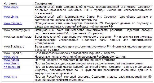 Немаловажную роль в понимании макроэкономических процессов, которые могут оказать влияние на деятельность фирмы, оказывает доступность источников информации. Нет информации – нет возможности сформировать модель и заложить в нее количественные показатели – нет исследования. Изучая информацию, мы стремимся найти сигналы, а затем и достроить картину происходящего. Это дает возможность спрогнозировать сценарии дальнейшего развития событий. Полезные источники макроэкономической информации РФ приведены в табл.3.1.