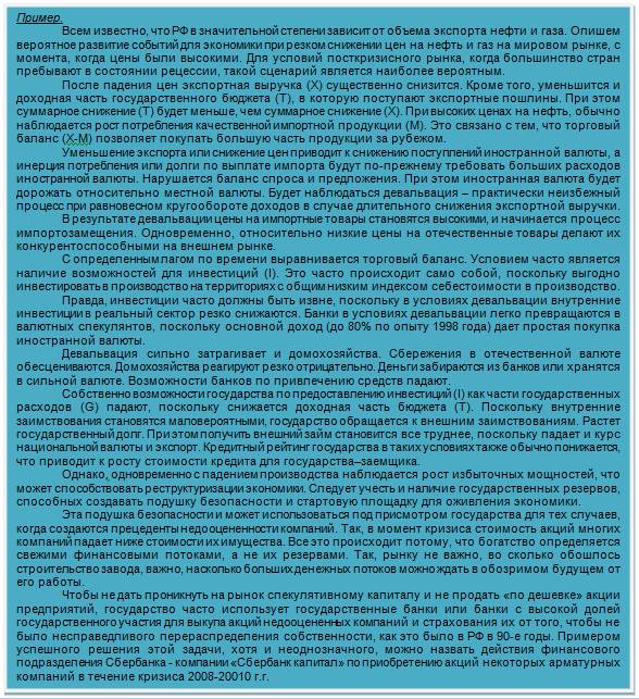 Воспользуемся схемой кругооборота доходов и условием равновесия экономики и опишем возможный сценарий развития событий для экономики РФ, как страны–экспортера энергоносителей при резком снижении цены на нефть на мировом рынке.