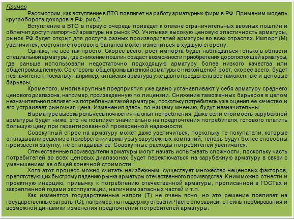 Наиболее вероятно, что многие предприятия-потребители арматуры будут вынуждены отложить инвестиционные приобретения качественной импортной арматуры. Это снизит совокупные доходы потребителей «С». Другим вероятным следствием будет то, что на рынок пойдет не новая арматура, а секонд хенд, неликвидная, контрафактная и т.п. Это способствует развитию серого импорта. Таким образом, своих целей государство, даже ставя таможенные барьеры, не добьется.