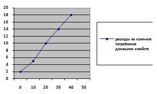 Для целей такого анализа используются данные о номинальном валовом внутреннем продукте РФ за длительный период и сведения о конечном потреблении домашних хозяйств за эти годы. Воспользуемся данными по расходам на потребление домашних хозяйств за 2000-2008 г.г., по данным Федеральной службы государственной статистики (www.gks.ru). Указанные года выбраны как года наиболее стабильного роста экономики, что позволяет отделить их от «возмущающих» факторов. Расходы на конечное потребление домашних хозяйств идут отдельной строкой и дают самый большой вклад в значения ВВП, рассчитанные по расходам. График расходов приведен на рис.3.3.