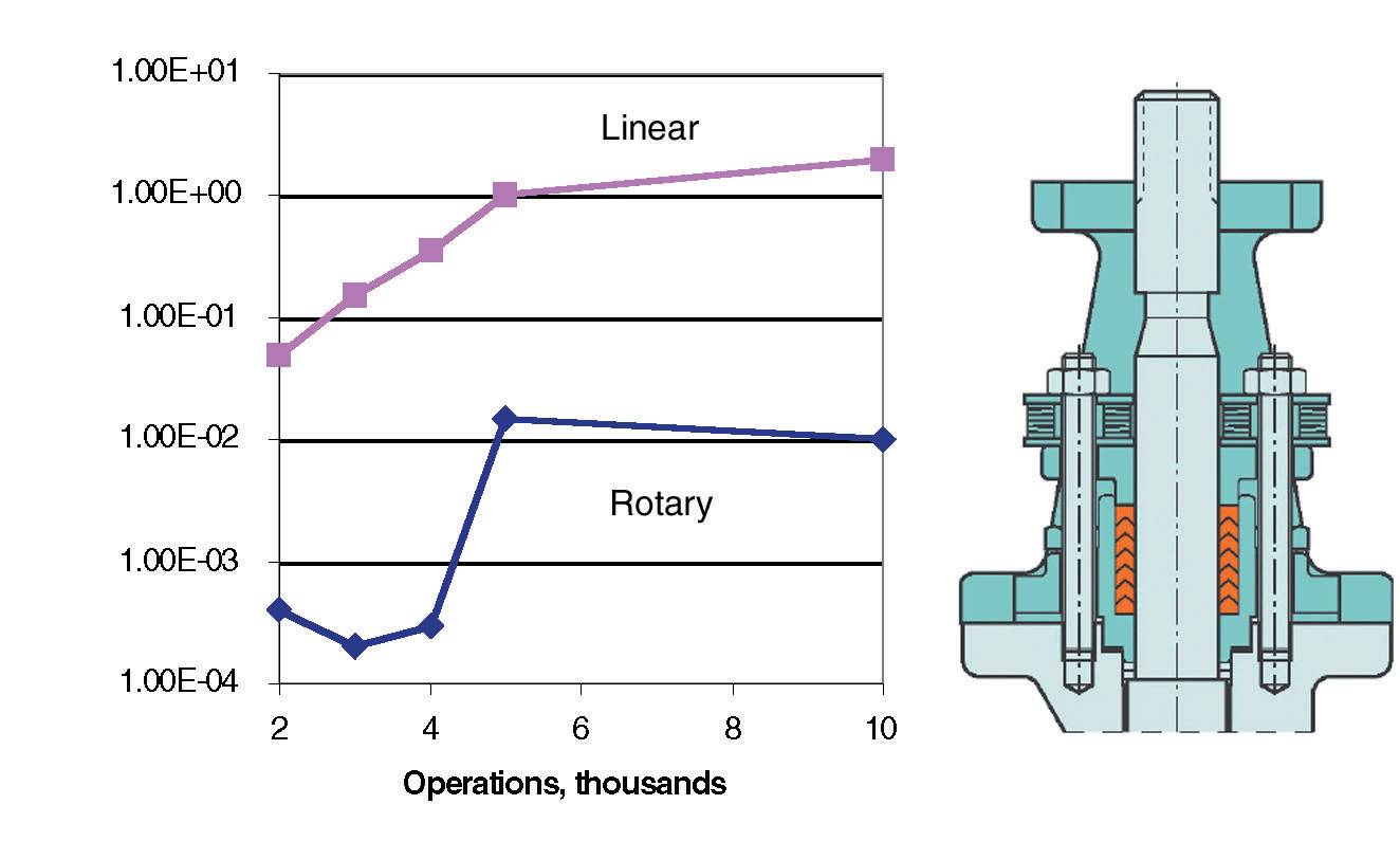 Поворотные клапаны демонстрируют в 100 раз меньшие показатели утечек через шток, чем стандартные линейные клапаны. Например, при динамической нагрузке для стандартной конструкции уплотнения штока поворотные клапаны Metso могут соответствовать самым современным стандартам по выбросам загрязняющих веществ (CAA, TA-Luft, ISO 15848) на уровне, практически равном уровню линейных клапанов с сальниковой набивкой сильфонного типа. Приведенные факты позволяют во много раз увеличить гарантии по циклам срабатывания, межремонтные интервалы и срок службы без ремонта в целом, рис. 11.