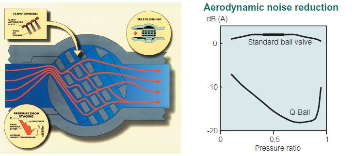 В затворах используется разделение ступеней давления, контроль скорости внутри него и разделение потока жидкости на множество струй. При использовании стандартных шумопонижающих клапанных затворов можно добиться снижения уровня шума до 20Дб. Технология Q-trim для поворотных клапанов была разработана компанией Neles в начале 80-х годов прошлого века и используется с тех пор во всех поворотных клапанах Metso размерами от 1 до 36 дюймов.