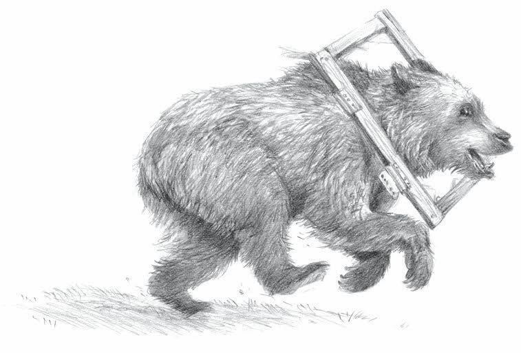 Что здесь стряслось! Медведь испугался так, словно по нему сто охотников из ружей выпалили. Рявкнул, свалил на пол бочку да в окошко. Стекло разбил, голову просунул, а дальше пролезть не может. Тогда он поднатужился, раму вырвал и так с рамой на шее убежал в тайгу.
