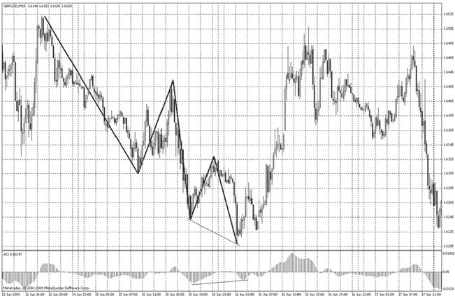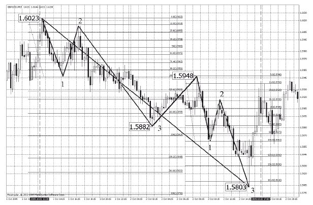 Всё движение 1.6023–1.5803 состоит из двух волновых формаций (1.6023–1.5882 и 1.5948–1.5803), которые в свою очередь соединены одной коррекционной волной (1.5882–1.5948). Если вы внимательно посмотрите на данный рис., заметите, что волны, обозначенные на рис. 1 и 2, в обеих формациях имеют похожие свойства: 1-я волна – короткая с глубоким откатом на вторую, 2-я не заходит за основание первой, а 3-я волна самая стремительная и длинная из трех. Я не буду забегать вперед, потому что волновому анализу посвящена отдельная глава. Но сейчас в качестве вывода скажу: умея структурировать рыночные движения и зная характеристики волн, а также закономерности, возникающие между ними, трейдер может с легкостью просчитать возможные варианты развития рыночной ситуации и в соответствии с этим найти оптимальные места для входа в рынок и последующего выхода из него.