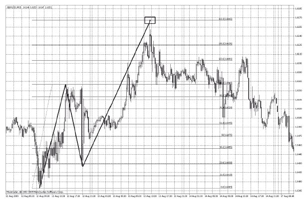 Посмотрите на рис. 10. Ценовой уровень 1,6214 является пересечением двух сеток Фибоначчи: